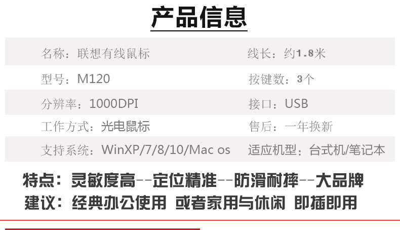 商品名称:联想(Lenovo)商务办公有线鼠标 USB接口 台式机笔记本通用电脑鼠标 经典537A线长约1.8米