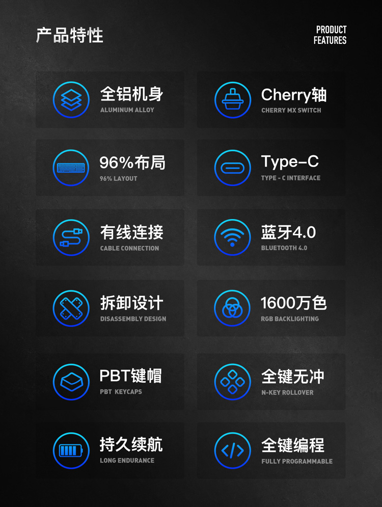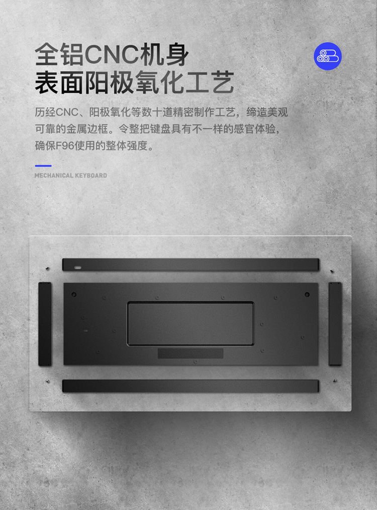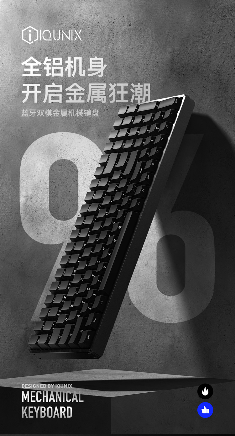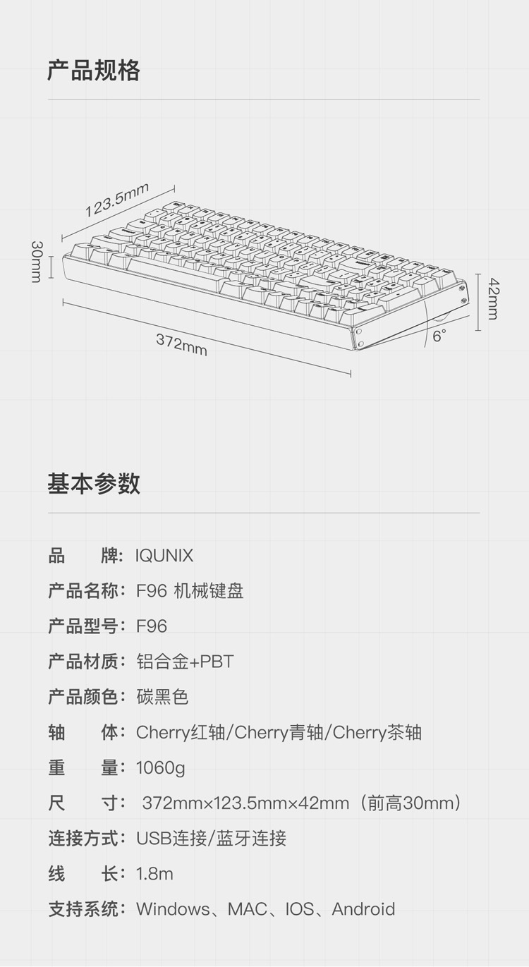 商品名称:iQunix F96碳黑版蓝牙机械键盘 CNC铝合金外壳 PBT键帽 100键游戏键盘 原厂樱桃Cherry轴体 RGB背光 茶轴